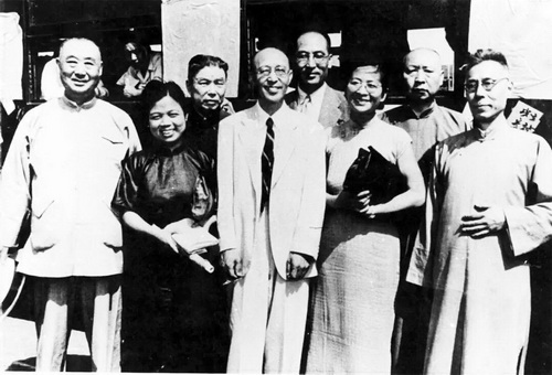 1946年6月23日,和平請愿團部分代表在上火車前合影。右起:馬敘倫、包達三、雷潔瓊、閻寶航、張?伯、盛丕華、胡子嬰(代表團秘書)、蕢延芳。