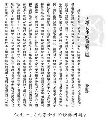 雷潔瓊先生這篇文章開宗明義提出,討論大學(xué)女生的修養(yǎng)問題,前提就在于如何認(rèn)清楚婦女問題。婦女問題的關(guān)鍵在于整個(gè)社會(huì)組織的男女關(guān)系問題。對(duì)此,她認(rèn)為: