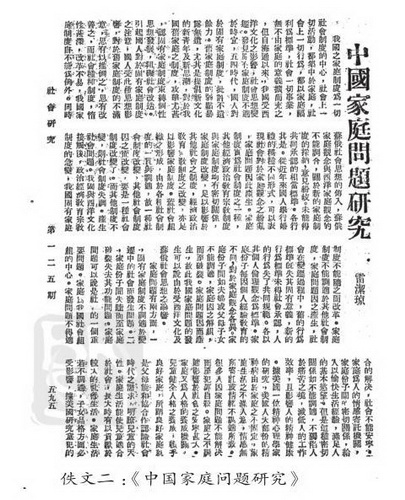 過去,大家都認(rèn)為發(fā)表于《社會(huì)學(xué)界》第九卷的《中國家庭問題研究討論》一文是雷潔瓊先生對(duì)中國家庭問題研究的開端。但筆者發(fā)現(xiàn)在此文刊登前一年,即1936年,雷潔瓊先生已在《社會(huì)研究》第一二五期上發(fā)表了名為《中國家庭問題研究》的文章,而《中國家庭問題研究討論》一文則是該研究議題的延續(xù)和更深入的討論。