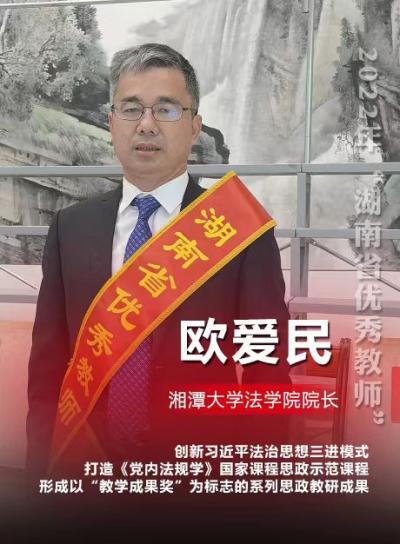 歐愛(ài)民教授是湖南省政協(xié)常委,民進(jìn)湖南省委會(huì)常委、湘潭市委會(huì)副主委,湘潭大學(xué)法學(xué)院院長(zhǎng)、博士生導(dǎo)師。他先后在《中國(guó)法學(xué)》等刊物發(fā)表學(xué)術(shù)論文100余篇,主持國(guó)家級(jí)、省部級(jí)等各類(lèi)課題40余項(xiàng),獲得省部級(jí)等各項(xiàng)獎(jiǎng)勵(lì)10余項(xiàng)。入選教育部新世紀(jì)人才、教育部課程思政教學(xué)名師、湖南省宣傳文化系統(tǒng)五個(gè)一批人才、湖南高校學(xué)科帶頭人等,被評(píng)為全國(guó)“七五”普法工作先進(jìn)個(gè)人、湖南省最具影響力的法治人物、湖南省最美公益普法人物。歐愛(ài)民教授創(chuàng)新教學(xué)方法,打造《黨內(nèi)法規(guī)學(xué)》國(guó)家課程思政示范課程,主持的教學(xué)成果《創(chuàng)新體驗(yàn)式教學(xué)法,造就德法兼修的社會(huì)主義法治人才》獲湖南省高校教學(xué)成果一等獎(jiǎng)。倡導(dǎo)“紀(jì)法雙修”育人目標(biāo),共培養(yǎng)黨內(nèi)法規(guī)學(xué)博士6人、碩士30人,為培養(yǎng)黨內(nèi)法規(guī)人才做出了有效的探索。