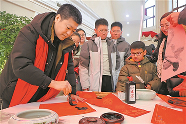 活動(dòng)現(xiàn)場(chǎng),來(lái)自民進(jìn)省委會(huì)開明畫院的書法家們鋪紙研墨,即席揮毫,為觀眾書寫飄散著墨香的一副副春聯(lián)和一張張“?!弊?,用實(shí)際行動(dòng)為新春文化建設(shè)增添喜慶。