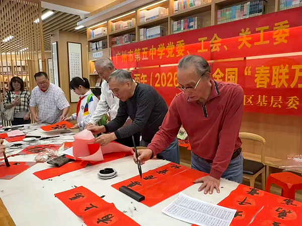 一直以來,民進(jìn)海珠區(qū)基層委員會(huì)始終重視“開明文化進(jìn)校園”工作,并將其作為全國(guó)民進(jìn)“春聯(lián)萬家”品牌活動(dòng)的核心載體之一。2026年,民進(jìn)海珠區(qū)基層委員會(huì)已陸續(xù)走進(jìn)海珠區(qū)客村小學(xué)、海珠區(qū)啟能學(xué)校、荔灣區(qū)真光文偉中學(xué)、海珠區(qū)黃埔中學(xué)等學(xué)校,通過書寫春聯(lián)、贈(zèng)送福字的形式,傳遞新春祝福與傳統(tǒng)文化魅力。此次與廣州市第五中學(xué)的攜手,是系列活動(dòng)的重要一站,也讓“春聯(lián)萬家·策馬啟新”的氛圍愈發(fā)濃厚。