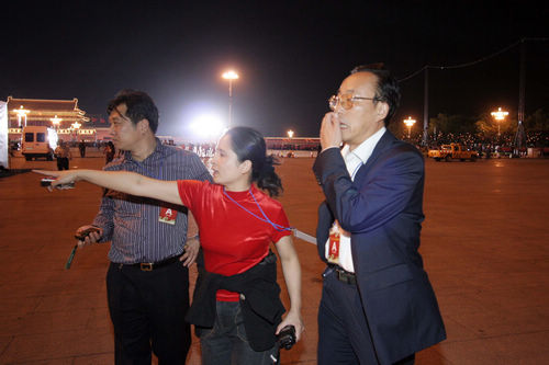 王敏 參加建國60周年群眾聯(lián)歡晚會與晚會總指揮副市長劉敬民在現(xiàn)場指揮參演群眾入場