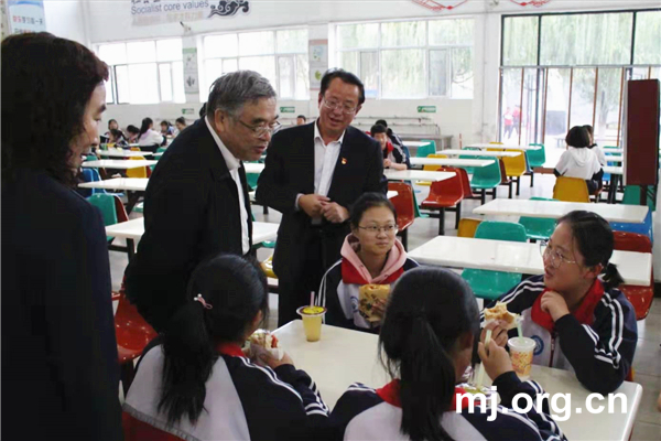 朱永新在當(dāng)?shù)刂袑W(xué)考察學(xué)生食堂。