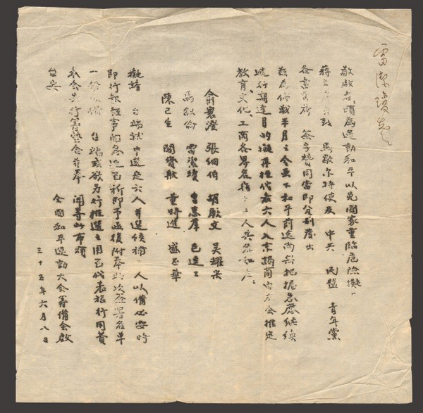 全國和平運動大會籌備會啟。三十五年六月八日?!?/p>