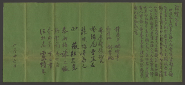 抗日戰(zhàn)爭勝利后,在中國共產(chǎn)黨的領導下,由中國民主促進會發(fā)起,聯(lián)合各黨派及各團體等52個單位,于1946年5月5日,在上海成立了上海人民團體聯(lián)合會。5月26日,決定組織上海人民反戰(zhàn)運動大會,并推舉馬敘倫等九人負責籌備,應該就是函中所說的全國和平運動大會籌備會?;I備會在5月31日第三次會議上決定,聯(lián)絡各界愛國知名人士,聯(lián)名致函各政黨及馬歇爾,呼吁和平,同時提出“必要時當推代表赴京”。
