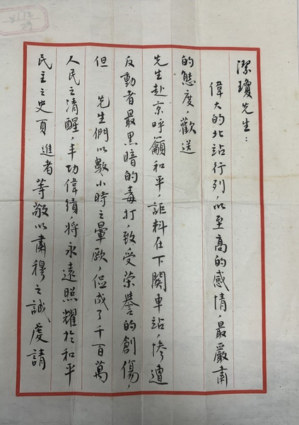 偉大的北站行列,以至高的感情,最嚴肅的態(tài)度,歡送先生赴京呼吁和平,詎料在下關車站,慘遭反動者最黑暗的毒打,致受榮譽的創(chuàng)傷。但先生們以數(shù)小時之暈厥,促成了千百萬人民之清醒,豐功偉績,將永遠照耀于和平民主之史頁。進者等以肅穆之誠虔請先生為在望之勝利,再接再厲,作最后成功之奮斗。謹當集我菲薄,誓為后盾,擁護諸公神圣之主張。冰山雖堅,熱力奔騰,瞻顧前途溶解匪遙,專函慰問。即祈為民珍重,善加保攝。并祝馬、閻、陳三先生暨高、浦二記者早復健康!