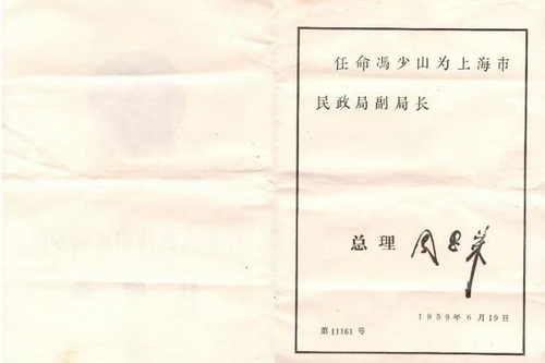 1959年,周恩來總理簽發(fā)的任命馮少山為上海市民政局副局長證書