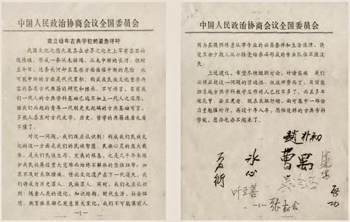 1995年3月3日,中國人民政治協(xié)商會(huì)議第八屆全國委員會(huì)第三次會(huì)議在北京召開,以全國政協(xié)副主席趙樸初為首,另有冰心、曹禺、夏衍、葉至善、啟功、吳冷西、陳荒煤、張志公,共9位德高望重的全國政協(xié)委員,聯(lián)名提出名為《建立幼年古典學(xué)校的緊急呼吁》的提案,被大會(huì)列為第016號(hào)提案。