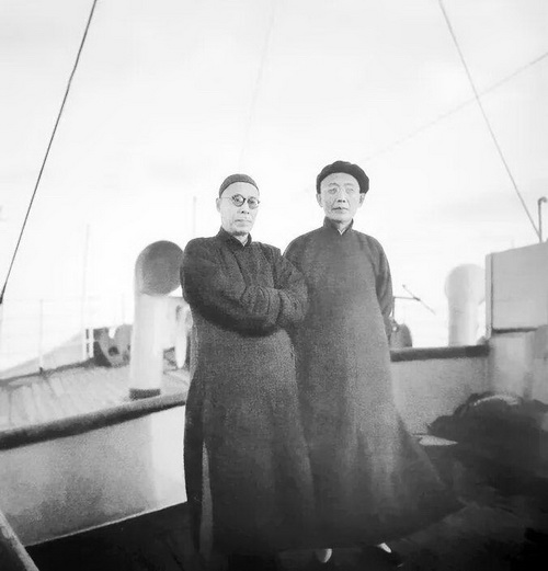 雖然航程中條件艱苦,但馬敘倫、許廣平等民主人士在船上留下了珍貴的影像資料,這歸功于隨民主人士北上的許廣平之子周海嬰。周海嬰用在香港臨行前買到的那架德國祿萊牌照相機(jī),為此行大多數(shù)民主人士拍攝了在船上的照片,多為三五人的合影。其中,馬敘倫在船上留下兩張照片,一張是與郭沫若的單獨合影,一張是與許廣平、郭沫若、曹孟君、侯外廬等民主人士的合影。馬敘倫身穿深色棉長衫,頭戴一頂無檐帽,目光堅毅地注視著鏡頭。