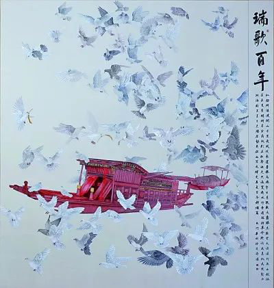 2021年是建黨百年,鄒英姿與蘇州著名工筆畫家華彬共同創(chuàng)作刺繡藝術(shù)品《瑞歌百年》,用針線表達(dá)對偉大的中國共產(chǎn)黨的熱愛和崇敬。為了完成好這樣一幅獻(xiàn)禮建黨百年的作品,鄒英姿專門跑到上海和嘉興南湖采風(fēng)學(xué)習(xí)?!敖衲晔侵袊伯a(chǎn)黨建黨100周年,作為新時代文藝工作者,應(yīng)該牢記藝術(shù)家的創(chuàng)作擔(dān)當(dāng),用手中的筆墨和針線歌頌偉大的時代,歌頌帶領(lǐng)著中華民族歷經(jīng)千難萬險(xiǎn)、走向偉大復(fù)興的中國共產(chǎn)黨?!编u英姿說。