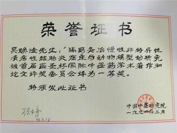 吳煥淦獲首屆“醫(yī)圣杯”國際中醫(yī)藥學(xué)術(shù)論文一等獎(jiǎng)。
