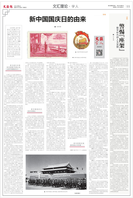 以10月1日為新中國國慶日,一般認(rèn)為是1949年10月9日由全國政協(xié)委員許廣平替馬敘倫委員在中國人民政治協(xié)商會議第一屆全國委員會第一次會議(以下簡稱全國政協(xié)一屆一次會議)上提出的。1949年10月10日,《人民日報》刊登的新華社電訊說:“在會議的其他項(xiàng)目中,有許廣平委員代表因病請假的馬敘倫委員提出建議,請政府明定十月一日為中華人民共和國國慶日,以代替十月十日的舊的國慶日。這個建議獲得全體一致的通過。”這一說法廣為流傳。