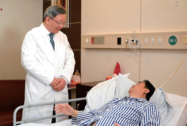 中國科學(xué)院院士、浙江大學(xué)醫(yī)學(xué)院附屬邵逸夫醫(yī)院院長蔡秀軍看望患者。醫(yī)院供圖