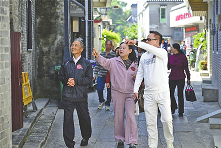 馮志康(中)、馮少山長孫馮解(左)等馮氏后人在鄉(xiāng)親的帶領(lǐng)下了解家鄉(xiāng)古鶴村。本報記者 余兆宇 攝