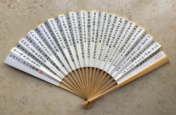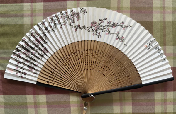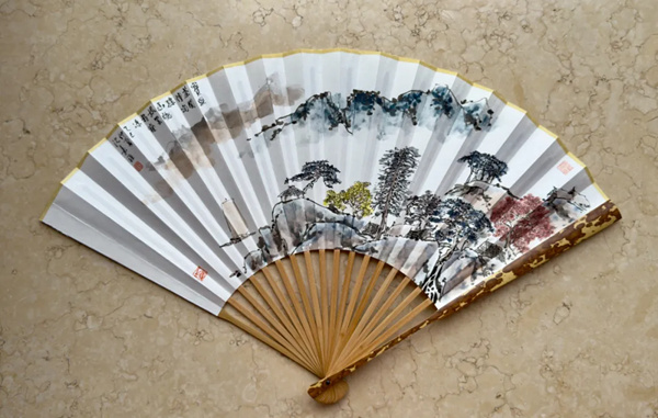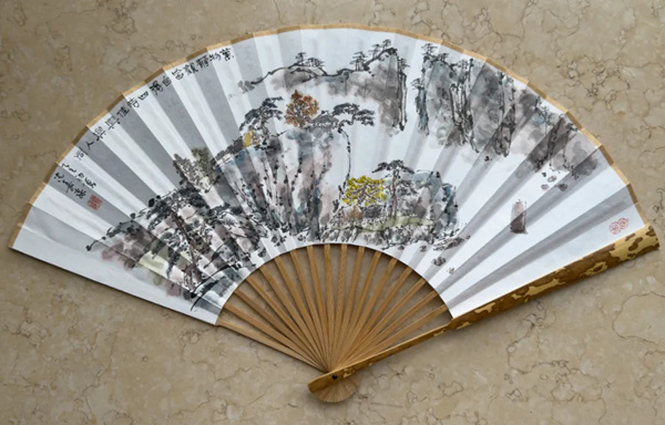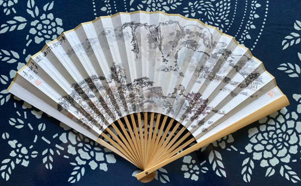 很久很久以后,在一次書畫筆會(huì)上,茆帆兄送我一把折扇,墨蘭丑石,骨骼清奇;蓋叫天的孫子張大根兄送我一幅扇面,墨分五色,魚戲蓮叢。折扇又來到我身邊。