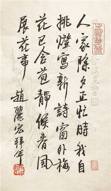 這些年,通過郵局寄來的賀年卡也越來越少了。不寄賀卡,親友的牽記和新春的問候當(dāng)然不會中斷。春節(jié)將近,桌上的手機(jī)響個(gè)不停,賀年的微信從全國各地甚至遙遠(yuǎn)的異域發(fā)到我的手機(jī)里。微信賀年,已經(jīng)成為新的習(xí)俗。對發(fā)來新年祝賀的朋友,不能來而無往,總要回應(yīng)一下。我曾經(jīng)埋頭于手機(jī),用拇指在手機(jī)鍵上打出不同的賀詞,回復(fù)手機(jī)賀年的各種各樣的朋友。做這件事,耗費(fèi)我很多時(shí)間,而且弄得頭昏眼花。對我這樣漸入晚境的老者來說,過年早已失去了兒時(shí)的興奮和激動。新年的鐘聲敲響時(shí),常常會為時(shí)光的流逝感嘆。除夕和春節(jié)的交接之時(shí),我總是習(xí)慣于一個(gè)人靜坐在我的小書房里,心里默默地想,這一年中,我做了些什么?是不是虛度了對我越來越顯得珍貴的歲月?為手機(jī)微信花費(fèi)這么多時(shí)間,實(shí)在有點(diǎn)不情愿。于是忽發(fā)奇想,能不能用一個(gè)簡單一點(diǎn)、花時(shí)間少一點(diǎn)、也能保持我個(gè)人風(fēng)格的方式,來回復(fù)那些雪片一般飛來的手機(jī)賀年微信呢?我想到的方式是,用毛筆在箋紙上寫幾句詩,內(nèi)容既能賀年,也能表達(dá)我的心情,然后拍照。寫在箋紙上的賀詞照片,就是我的微信賀年卡。發(fā)一張照片,比在微信中寫賀詞,要省事許多,瞬間就能把賀詞照片作為回復(fù)發(fā)到朋友的手機(jī)。