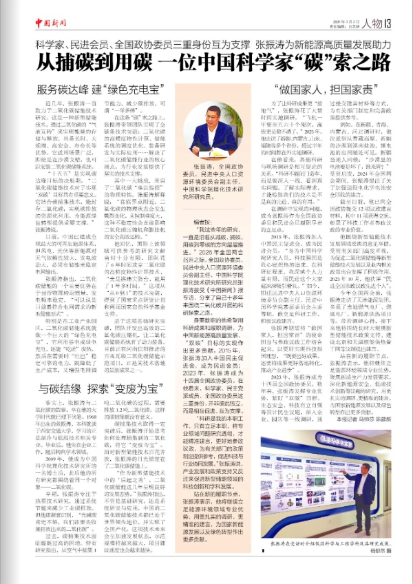 ?。ㄔ瓨祟}為:科學家、民進會員、全國政協(xié)委員三重身份互為支撐 張振濤為新能源高質(zhì)量發(fā)展助力 從捕碳到用碳 一位中國科學家“碳”索之路)