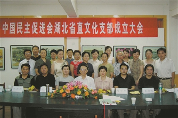 1989年,王春桂作出了另一個重要選擇——加入中國民主促進會?!爱?dāng)時文化界會員少,我就跟當(dāng)時的民進湖北省委會主委蔡述明建議:‘咱們成立個文化支部吧。’”1990年,民進湖北省直文化小組成立,王春桂任組長;1994年,民進湖北省直文化支部正式成立,王春桂任支部主委。王春桂拿出珍藏的合影,仔細辨認:“后排左八是我,前排左一是后來成為湖北大鼓名家的付群剛?!边@個以“團結(jié)文化界人士”為初衷的支部,成為她后來參政的重要平臺。