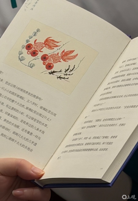 寫(xiě)字板本是孩童嬉戲之物,也許廠(chǎng)家也不會(huì)想到,竟有一位七十歲的兒子,會(huì)用它為一百歲的母親畫(huà)了這么多畫(huà)。四顆紅色圓形磁石,被靈活地用作畫(huà)作的“點(diǎn)睛之筆”:畫(huà)金魚(yú)時(shí)成為“水泡眼”;畫(huà)三毛時(shí)變成手中的紅燈籠;畫(huà)壽桃時(shí),起初是盤(pán)中的壽桃,后又幻化為青花瓷缸上的裝飾;畫(huà)漁船時(shí),則成了漁船歡快的“大眼睛”。在趙麗宏為母親畫(huà)的最后一幅畫(huà)中,它們又變成了兩個(gè)飛在空中的天使的臉龐。