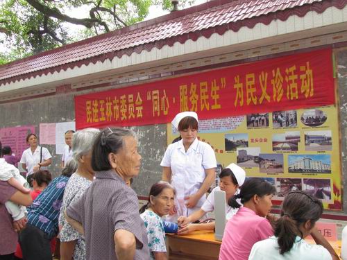 支部先后組織會員參加市委會開展的送醫(yī)下鄉(xiāng)、同心·服務民生等為民服務活動。一是參與送醫(yī)下鄉(xiāng)活動。2009年7月,市委會聯(lián)合民盟玉林市委會、九三學社玉林市委會到北流市大里鎮(zhèn)開展送醫(yī)下鄉(xiāng)活動,支部會員李平作為醫(yī)療隊隊員之一,與民盟、九三學社市委會的醫(yī)務工作者一起,共為大里鎮(zhèn)近150名鎮(zhèn)、村兩級干部進行義務體檢,獲得好評。二是參加下鄉(xiāng)為民服務活動。2011年5月,支部會員中的醫(yī)衛(wèi)、教育專家胡武仁、唐家超、李平、黎南等,參加了市委會組織的赴興業(yè)縣大平山鎮(zhèn)及大平山鎮(zhèn)陳村開展的為民義診、法律咨詢、培訓村醫(yī)和農(nóng)村婦女文藝骨干、中小學公開課等一系列的社會服務活動。在為民義診活動中,共義診、咨詢300多人次。三是參加市委會開展的同心·服務民生社會服務活動。2012年6月,支部會員中的醫(yī)衛(wèi)專家參加了市委會組織的同心·服務民生為民義診活動, 共義診、咨詢200多人次。