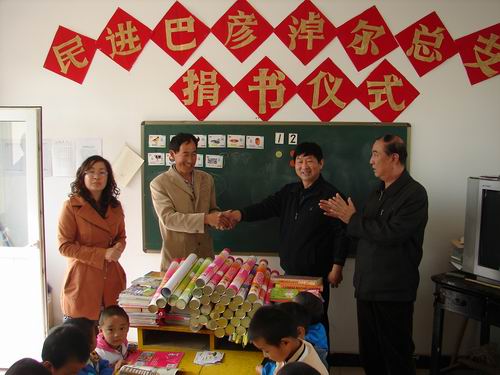 2010年10月9日,在總支名譽(yù)主委張建方同志的帶領(lǐng)下,民進(jìn)巴彥淖爾市總支向?yàn)趵厍捌祛~爾登布拉格民族幼兒園捐贈(zèng)價(jià)值三千多元的圖書(shū)。